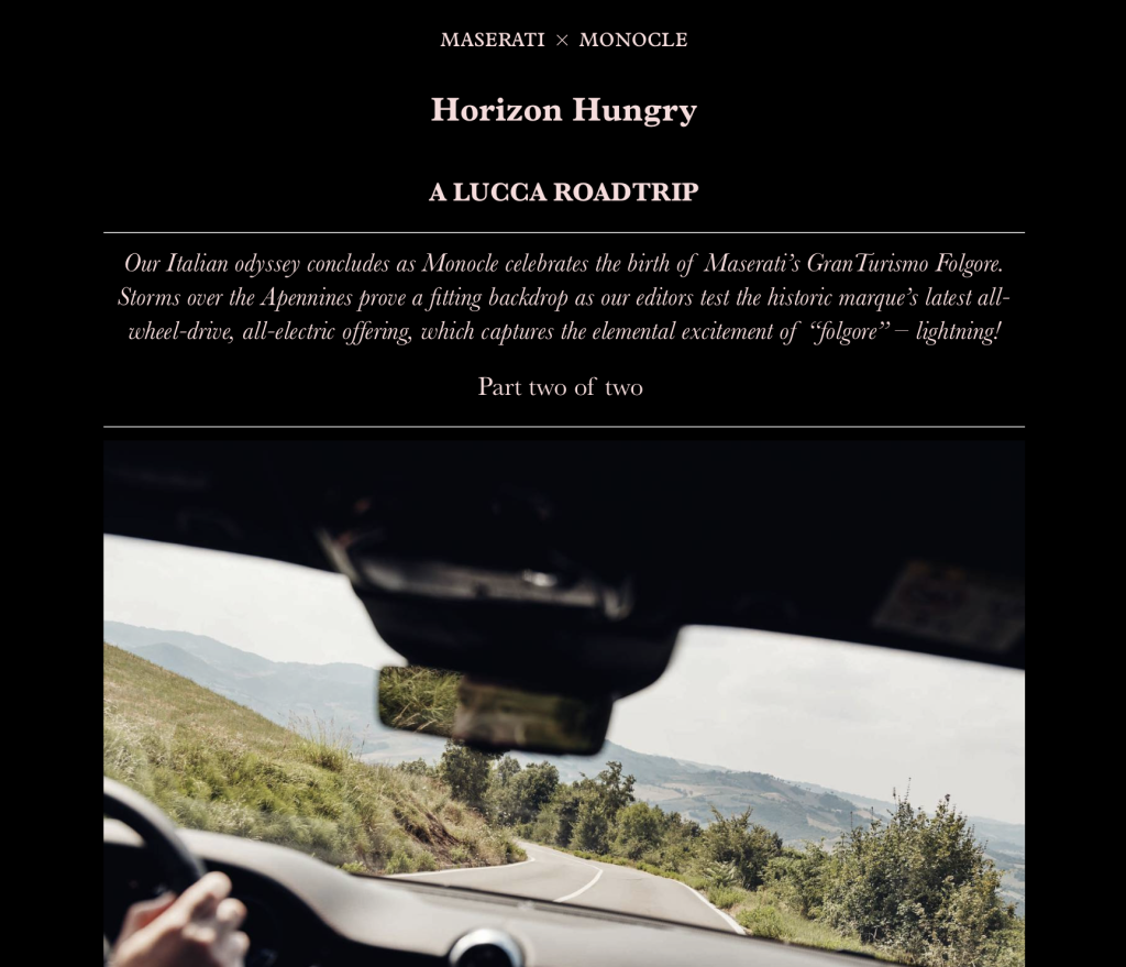 The exact way you should learn of the new electric Maserati, within the confines of a Monocle road trip.